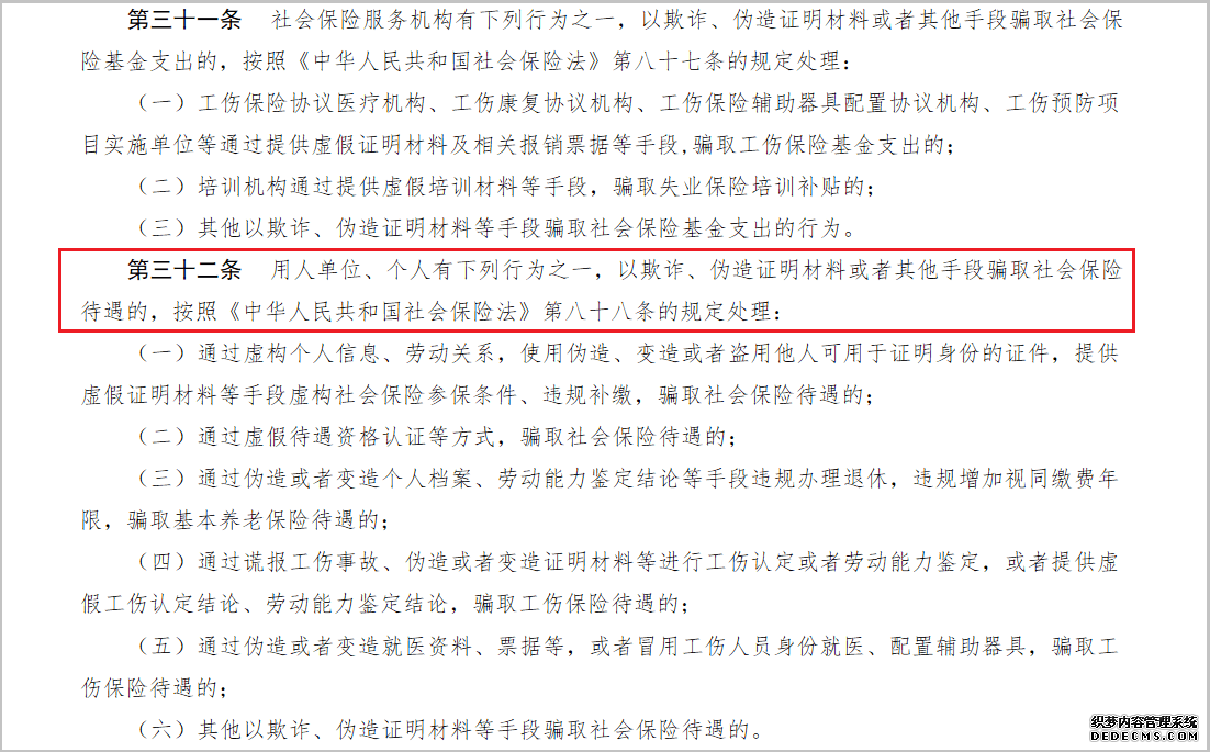第三十二条 用人单位、个人有下列行为之一,以欺诈、伪造证明材料或者其他手段骗取社会保险待遇的,按照《中华人民共和国社会保险法》第八十八条的规定处理: